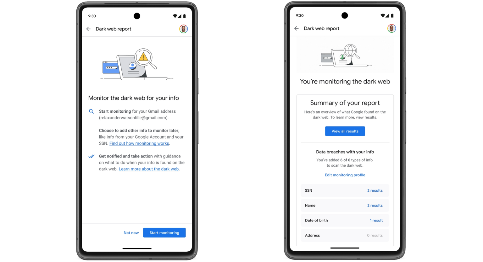 Sucht im Darknet nach deiner E-Mail, Telefonnummer oder Adresse (Gmail/Google One erforderlich).