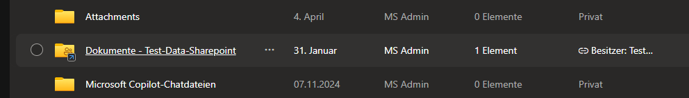 Ein Klick auf "Verknüpfung zu OneDrive hinzufügen" fügt eine direkte Verknüpfung in dein OneDrive hinzu, hier zu sehen Test-Data-Sharepoint: