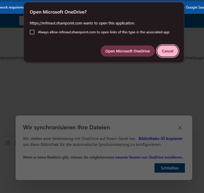 Wenn du nur diesen Einen Sharepoint in dein Windows einbinden willst klicke auf "Synchronisieren" nun öffnet sich ein Dialog der die OneDrive App öffnen möchte, das bestätigen wir.